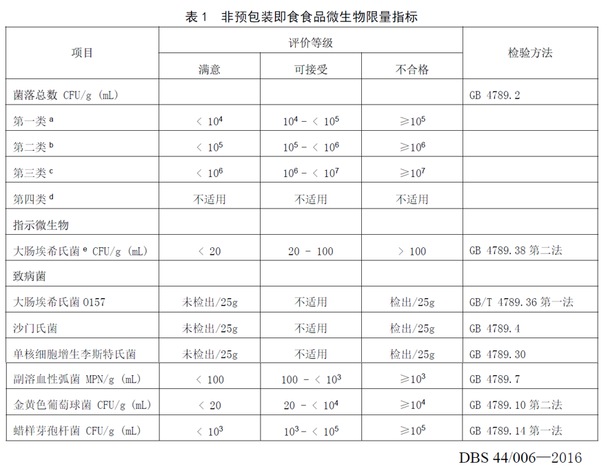 廣東地方標(biāo)準(zhǔn)對(duì)非預(yù)包裝即食食品微生物限量指標(biāo)