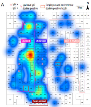 從感染的顧客中篩查到 5 個人,IgG 和 IgM 均呈陽性,他們在新發(fā)地的交集是 S14 攤位。(IgM 表示感染時間比較早)