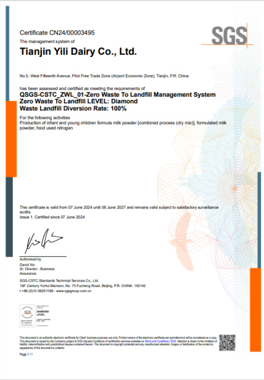 伊利集團首家廢棄物零填埋工廠誕生!伊利集團嬰幼兒營養(yǎng)品事 業(yè)部天津伊利乳業(yè)有限責任公司獲得由全球領先的認證機構(gòu) SGS ...